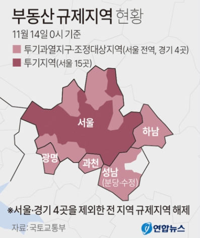 이번에 수도권도 대거 해제함에 따라, 규제지역은 서울, 과천, 성남(분당·수정), 하남, 광명만 남게되었습니다.