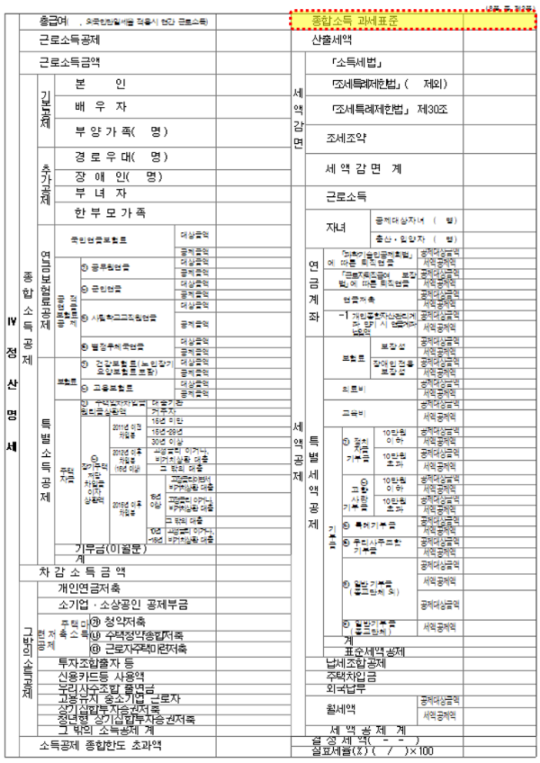 작년과 큰 차이가 없으신 분들은, 원천징수영수증 양식에서 종합소득 과세표준이 얼마였는지 확인하시면 됩니다. 종합소득 과세표준에 위의 세율을 곱하면 산출세액이 정해집니다.
