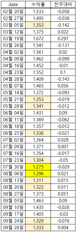 지난주 최종영업일은 일반적으로 금요일이니 금요일 전 영업일인 목요일 종가를 적용한다는 이야기입니다. 즉, 목요일 종가의 추이를 보시다가 낮게 느껴질 때 타이밍을 잡으면 됩니다.