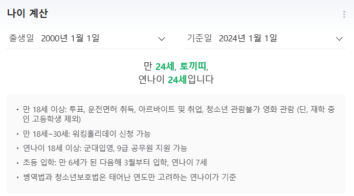 * 네이버 나이계산을 돌려 봅니다. 24년 1월 1일기준으로 만 24세인 것을 확인할 수 있습니다.