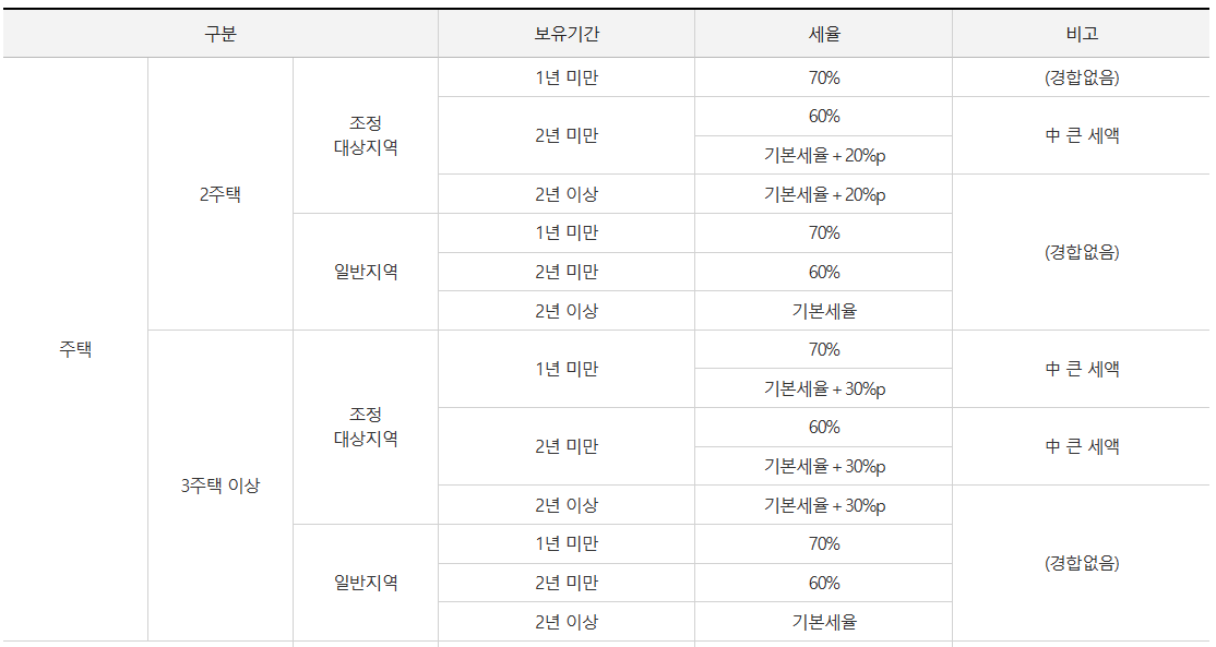 ※ 현재 보유기간 2년 이상인 주택은 '22.5.10 ~ '24.5.9 사이에 양도할 경우, 다주택자 중과를 면제해 주고 있어, 기본세율을 적용하고 있습니다.