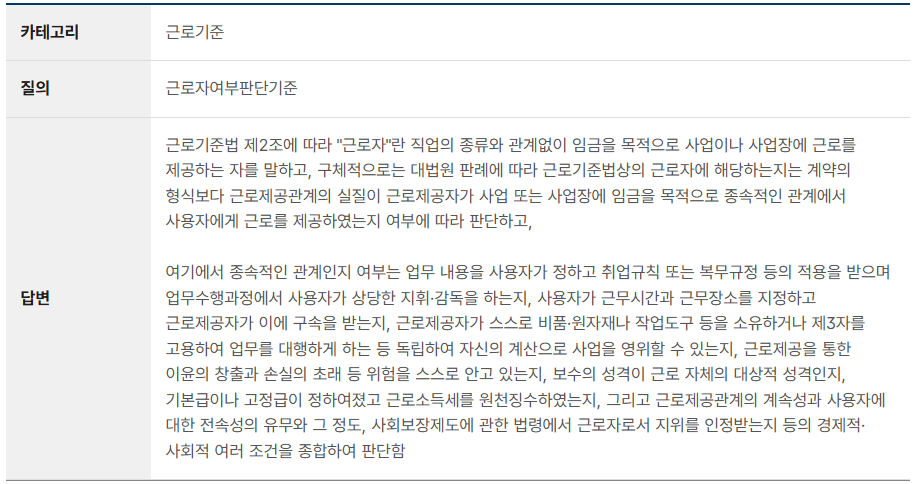 ※ 근로자성 : 근로자 여부를 판단하는 기준을 말합니다. 아래 고용노동부의 FAQ 답변을 참고하시기 바랍니다.