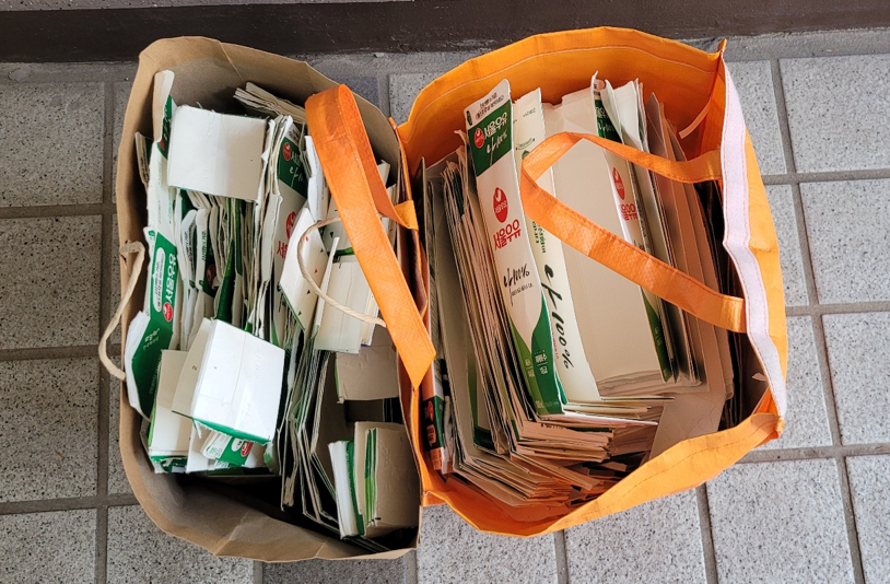 * 참고로 종이팩 1kg은 200㎖ 100개, 500㎖ 55개, 1,000㎖ 35개 정도 모여야 한다고 합니다.