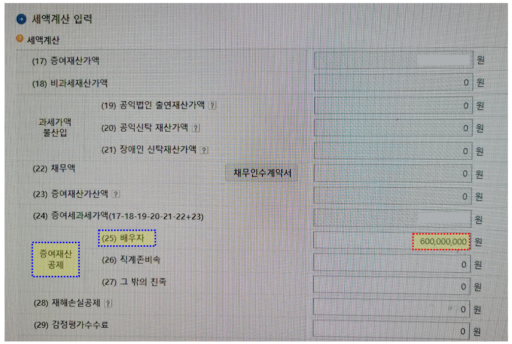 세액계산 입력에서는 아래와 같이 [증여재산 공제] 에서 증여자와의 관계 및 증여자에 따른 증여재산 공제액을 입력하면 됩니다. 배우자는 10년간 6억, 직계존비속은 10년간 5천만원(미성년자는 2천만원) 등을 입력하면 됩니다.