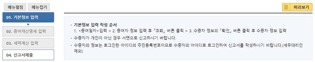 기본정보는 증여자(증여하는 사람), 수증자(증여받는 사람) 정보 등을 안내에 따라 입력하면 됩니다.