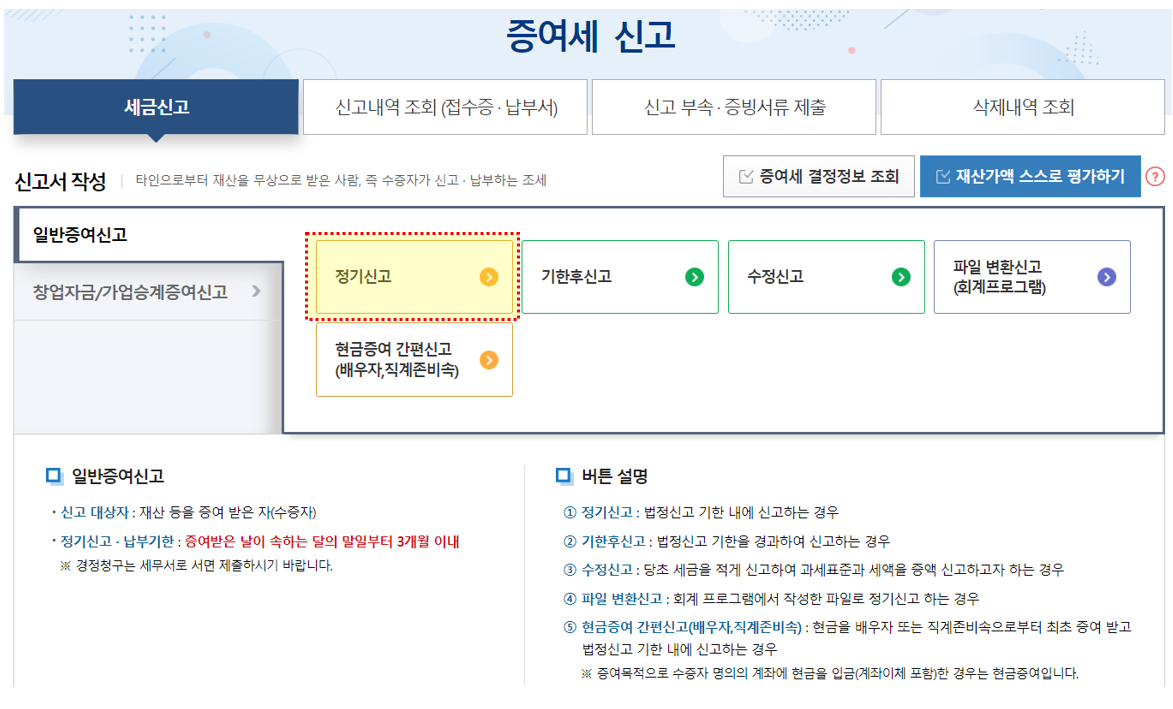 증여세 납부기한은 증여받은 날이 속하는 달의 말일부터 3개월 이내 입니다. 예를들면, '22.9.21 증여를 받았다면, 9월말일인 9.30일부터 3개월 이내 즉 12월 31일까지 신고해야 합니다. 따라서, 12월 중에 신고한다면 기한 내 신고이기 때문에 '정기신고'로 들어갑니다.