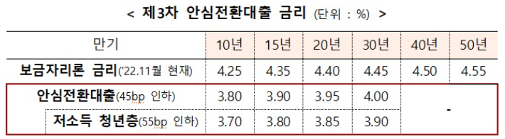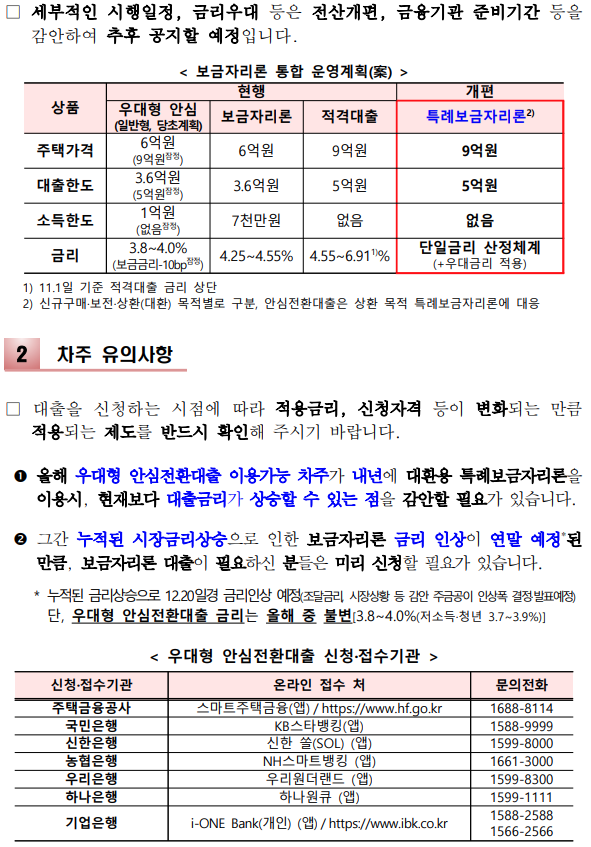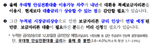 ※ 손경제에서는, 정부 발표문 하단부에 있는 내용을 주목하라고 합니다. 올해 안심전환대출을 받을 수 있는 분들이나 보금자리론을 받을 수 있는 분들은 12.20일경 금리 인상 전에 대출을 받으시라는 안내가 있습니다. (~12.19까지 신청필요) 이 말은 내년의 특례보금자리론의 금리는 안심전환대출이나 보금자리론 보다 금리가 더 높을 것으로 예상되기 때문이라고 합니다. (내용추가)