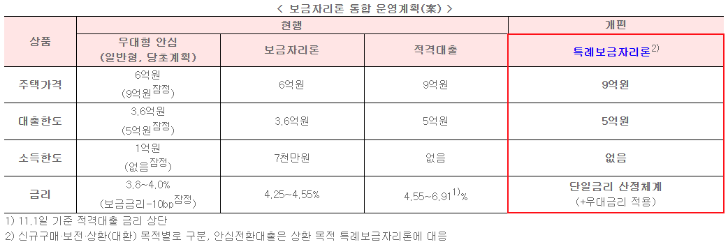 일반형 안심전환대출, 적격대출, 보금자리론 → 특례보금자리론으로 통합 운영