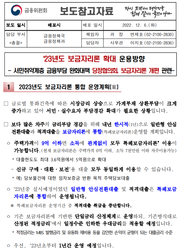 금융위원회에서는 12.6 「2023년도 보금자리론 통합 운영계획안」을 발표했습니다. 보다 많은 분들에게 금리부담 경감을 내년 한시적(1년)으로 제공할 계획이라고 합니다.