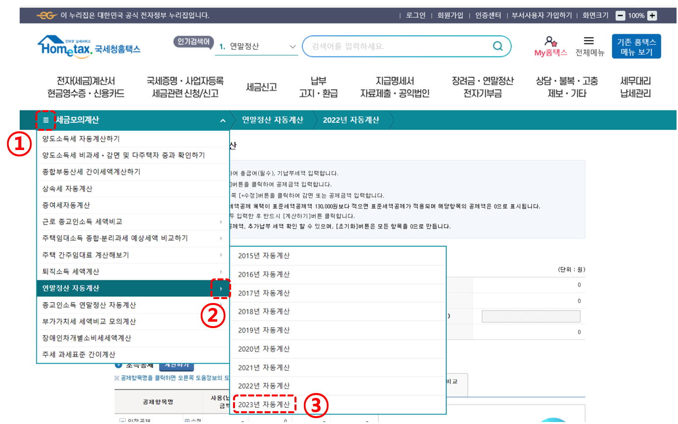 아래와 같이, 세금모의계산의 三 메뉴버튼을 누른 후 → 연말정산 자동계산의 ▶ 화살표를 누릅니다. → 그러면 드디어 2023년 자동계산 메뉴로 이동할 수 있습니다.