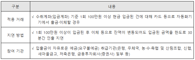100만원 이상이 입금된 계좌에서는 입금 후 30분이 지나야 ATM기기로 인출할 수 있다는 의미입니다. 거의 모든 금융기관(은행, 우체국, 농협, 수협, 축협, 산림조합, 신협, 새마을금고, 저축은행, 증권사 일부 등)에서 시행하고 있습니다.