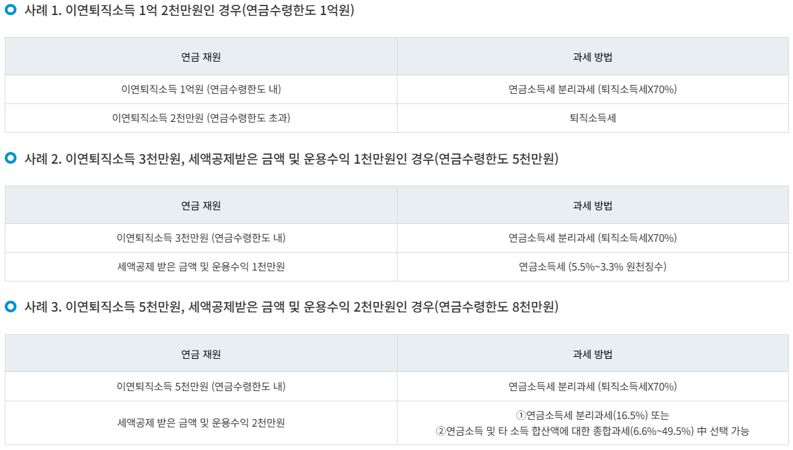 가장 좋은 방법은 이연퇴직소득(제원이 퇴직금인 IRP)은 연금수령 한도 내에서 수령하고, 세액공제받은 금액과 운용수익이 있는 IRP는 연간 1,500만원 이내에서 수령하여 연금소득세(5.5~3.3%)만 납부하는 것이 최고의 절세방법입니다.