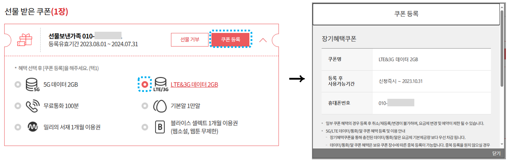장기혜택쿠폰 가족에게 쿠폰 선물하기