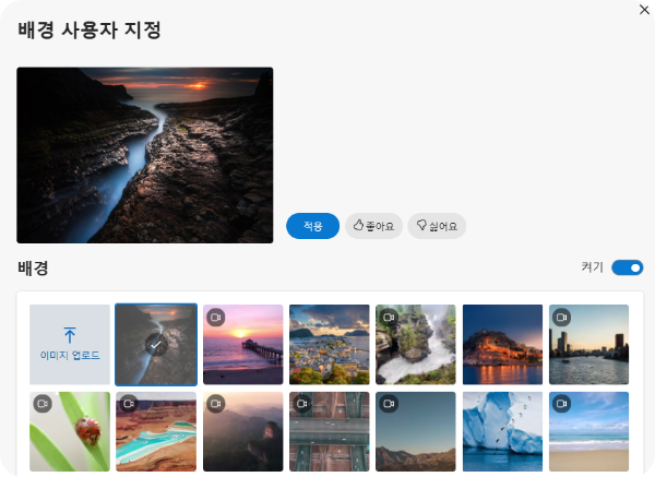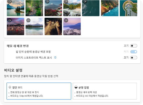 배경화면을 설정할 수 있는 설정입니다. 배경화면을 Off로 할 경우, 하얀 깨끗한 배경을 만드실 수 있습니다. 또는 배경화면을 On으로 설정하여 다양한 배경화면 중에 선택하여 적용할 수도 있고, 매일 변화되는 다양한 이미지를 적용할 수도 있습니다.