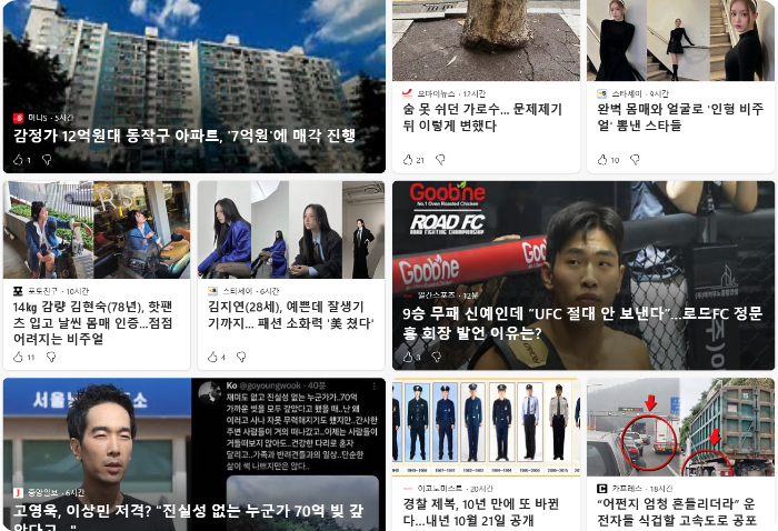 각종 기사와 광고를 보여주는 콘텐츠를 표시하거나, 아래쪽에 일부만 부분적으로 표시할 수도 있습니다. 또는 주요 콘텐츠의 분류만 아래쪽에 제목만 표시할 수 있습니다.